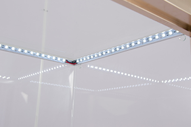 普通玻璃,超白玻璃 | LED燈嵌入燈槽,槽內(nèi)安全裝電線卡拉,電線不外露安全美觀 | 鋁合金型材對(duì)角拼接,氧化處理防生銹,拉絲效果防指紋 |
